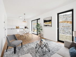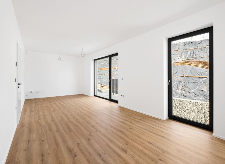 Obývací pokoj s kuchyňským koutem je srdcem bytu a plynule navazuje na terasou o velikosti 11 m². Ta vás zve k ranní kávě i večerním posezením s přáteli. Soukromá zahrádka je pak skvělým místem pro relaxaci, dětské hry nebo menší domácí zahrádku.