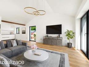 - prostorný obývací pokoj s kuchyňským koutem a vstupem na terasu