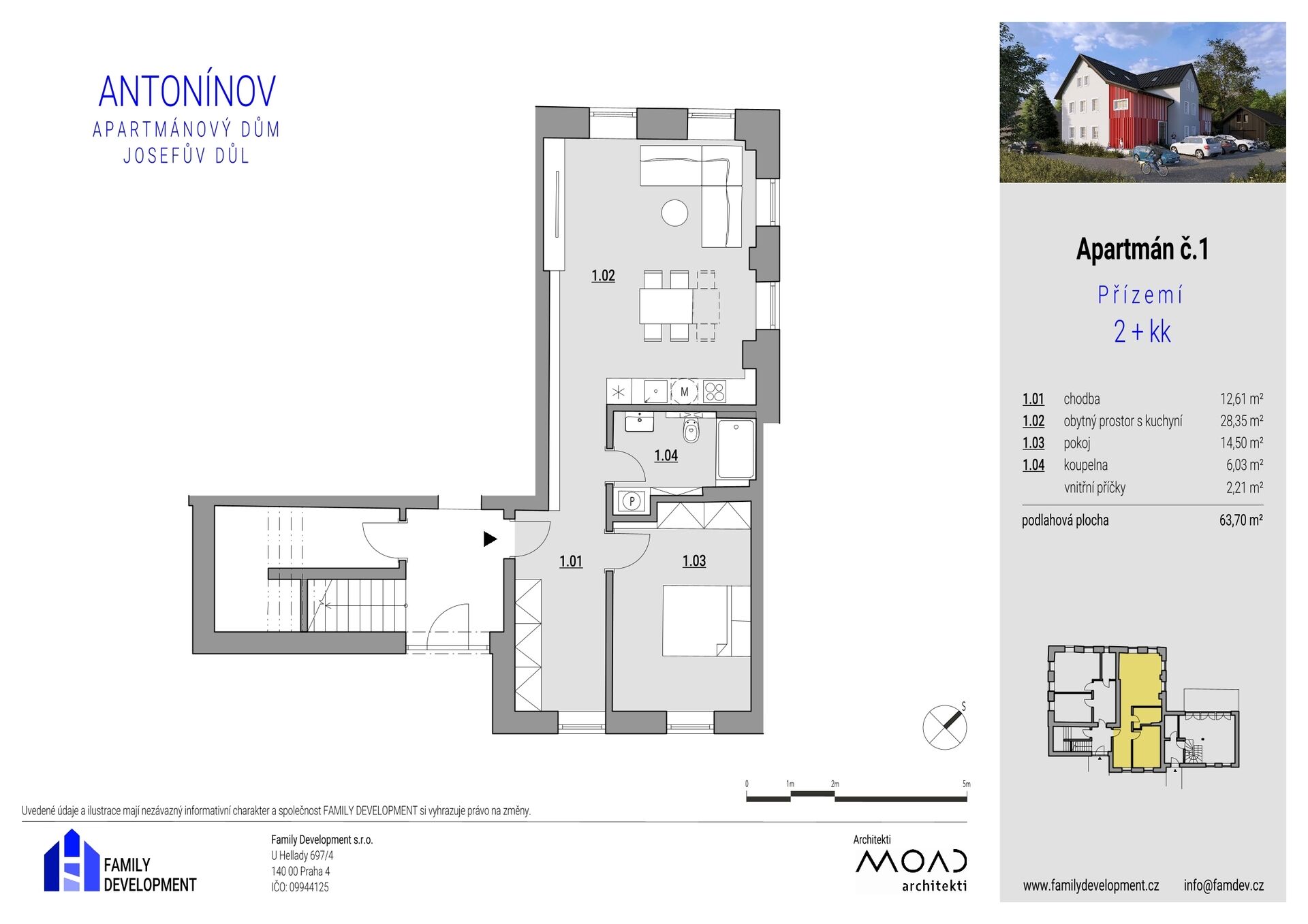 Apartmán nabízí světlý obývací prostor s přípravou na kuchyň, ložnici, koupelnu se sprchovým koutem a toaletou a předsíň. Součástí jednotky je sklepní kóje s dostatkem úložného prostoru a venkovní parkovací stání