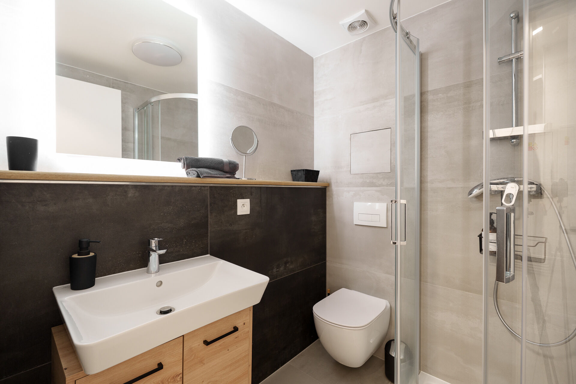 Obytný prostor je vybaven dřevěnou podlahou, která dodává interiéru příjemnou horskou atmosféru. Součástí je kuchyňská linka s vestavnou troubou, varnou deskou a lednicí, která poskytuje vše potřebné pro pohodlné užívání i krátkodobé pobyty. Koupelna je řešena v moderním stylu a nabízí sprchový kout a toaletu.