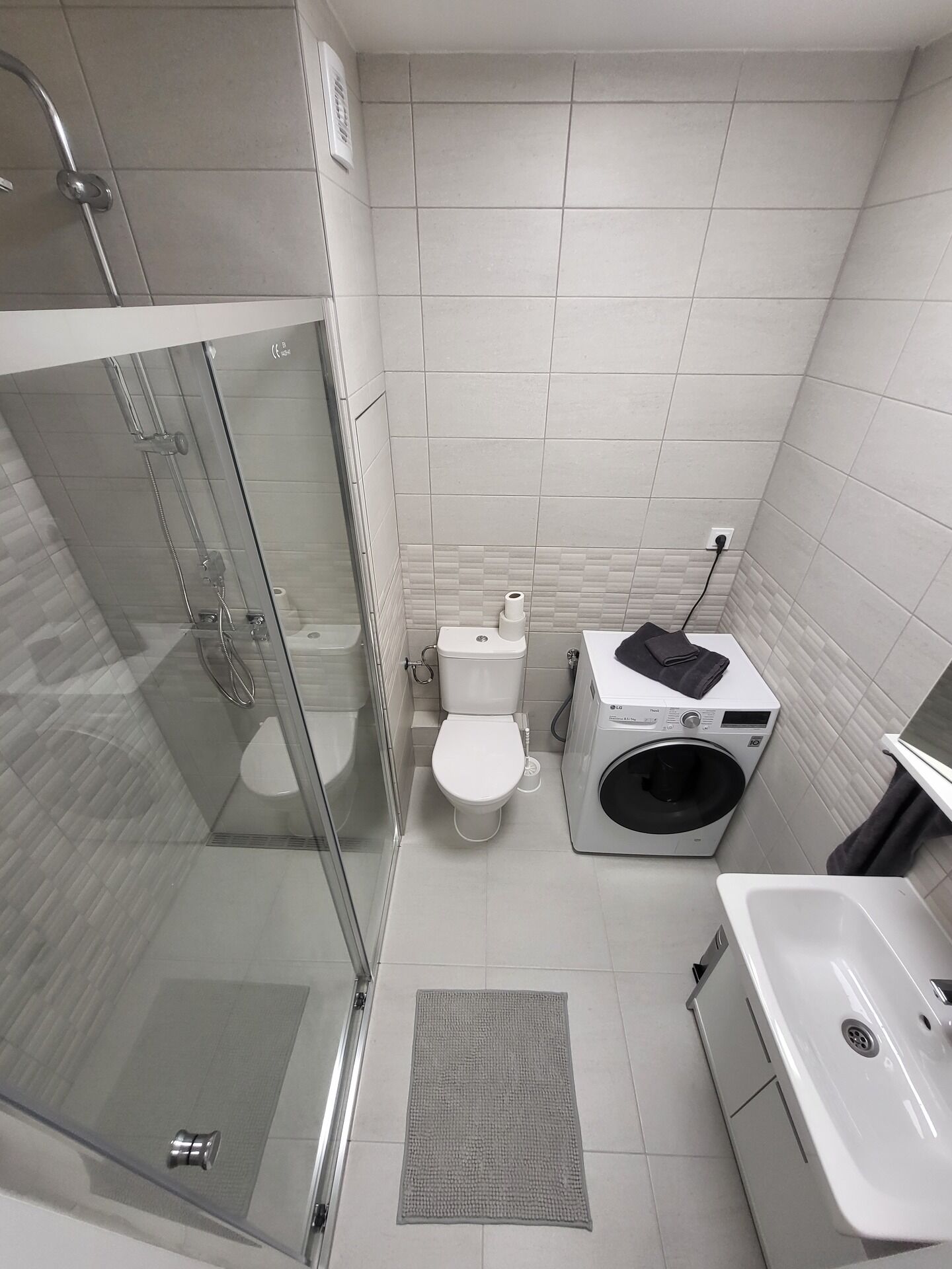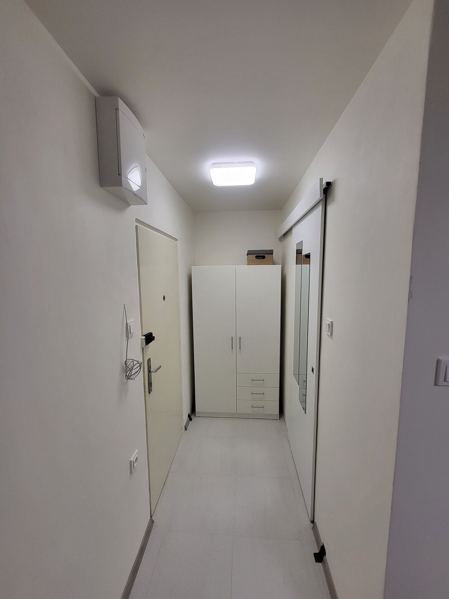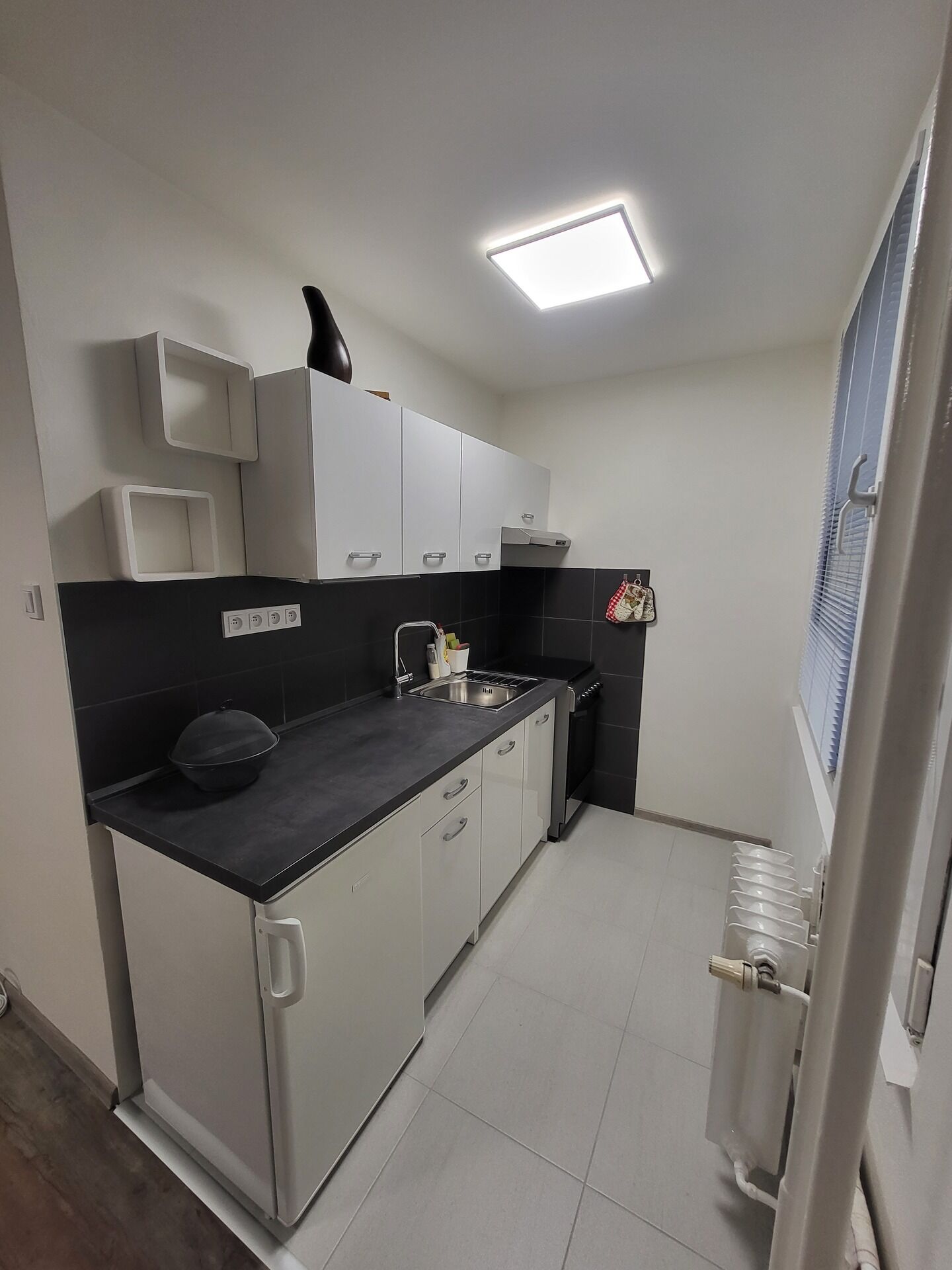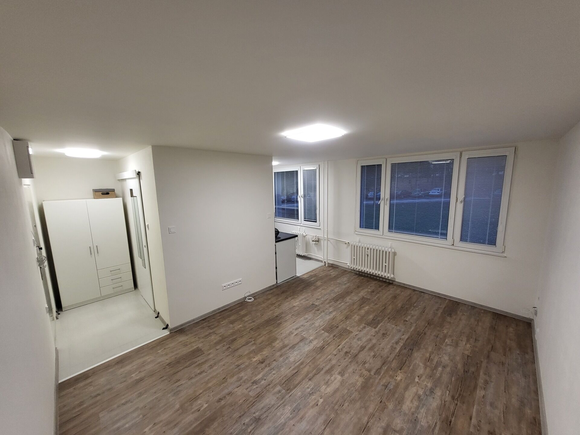 Byt disponuje vstupní halou se šatní skříní, koupelnou (sprchový kout, umyvadlo se skříňkou, pračka se sušičkou, WC), dále pak obytnou místností (TV na stěně) a za rohem i plně vybavenou kuchyňskou linkou (lednice, trouba, varná deska,...).