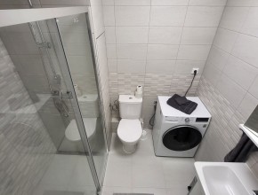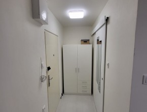 Byt disponuje vstupní halou se šatní skříní, koupelnou (sprchový kout, umyvadlo se skříňkou, pračka se sušičkou, WC), dále pak obytnou místností (TV na stěně) a za rohem i plně vybavenou kuchyňskou linkou (lednice, trouba, varná deska,...).