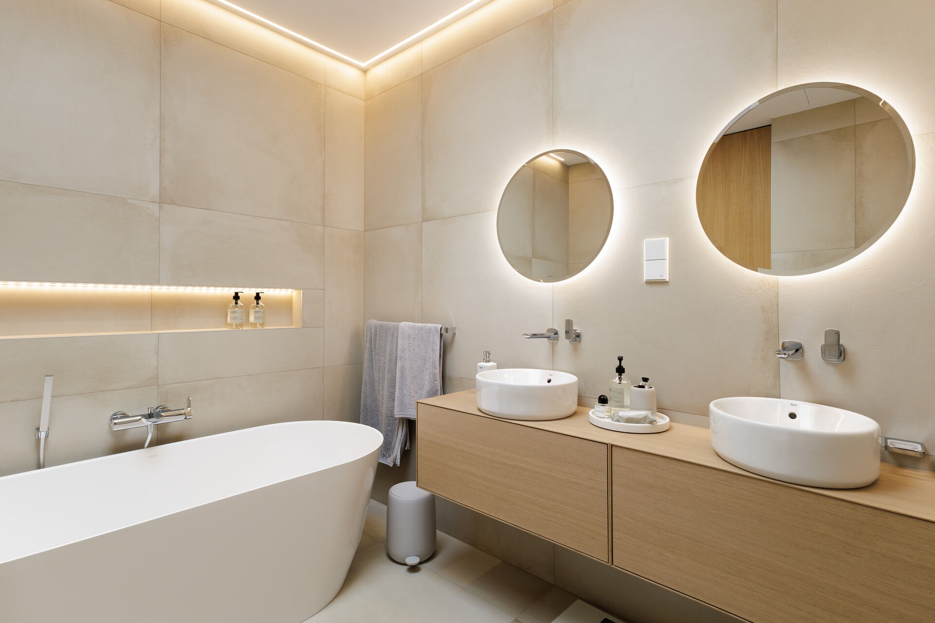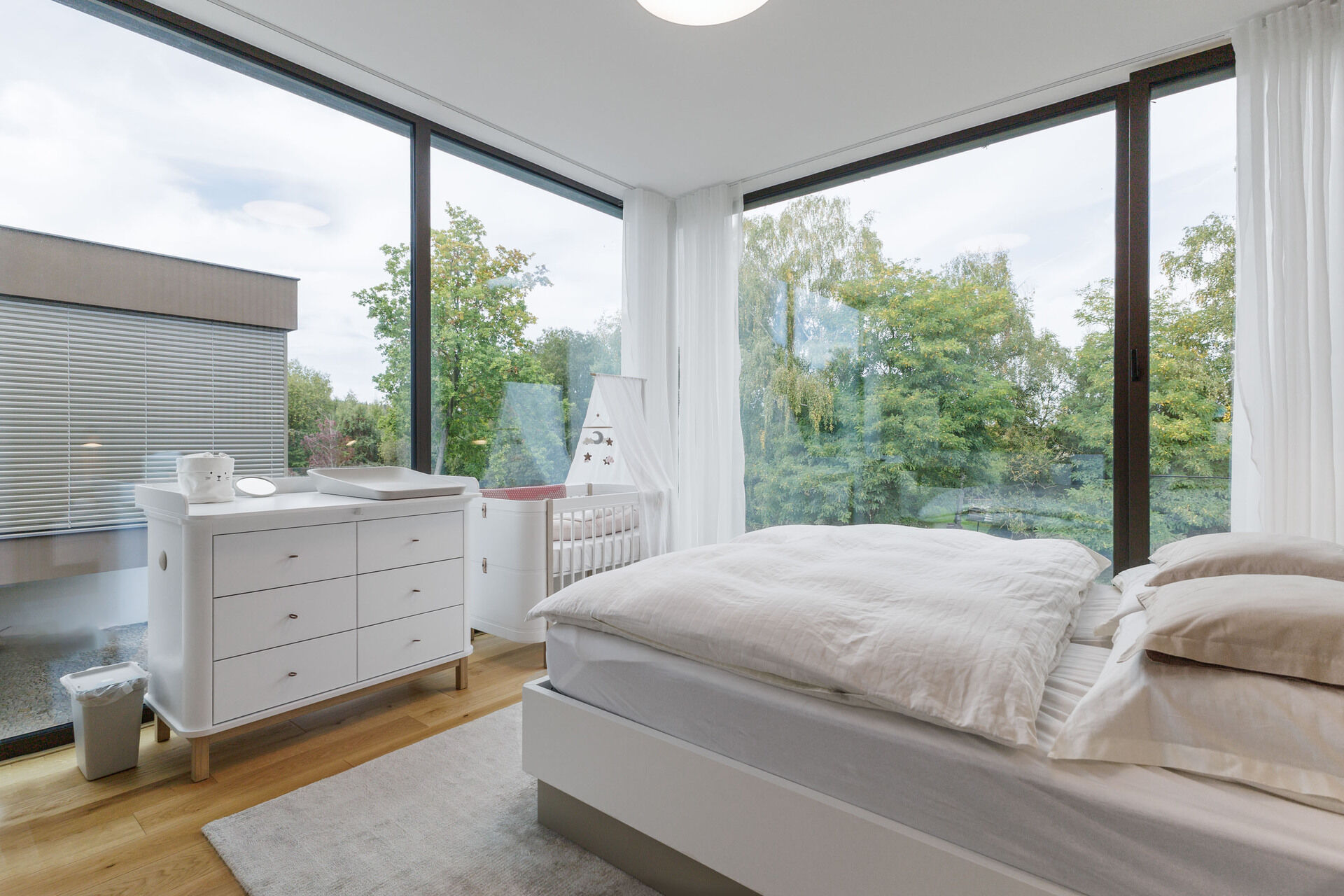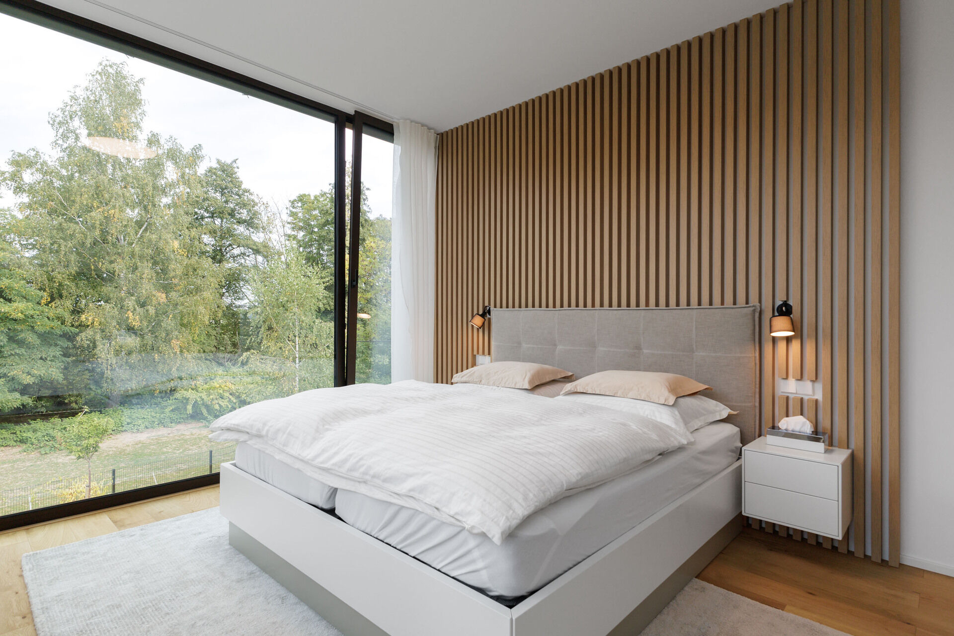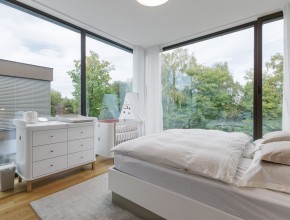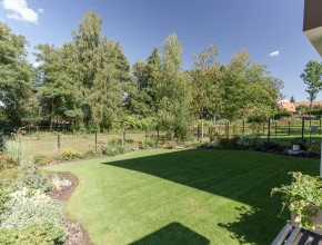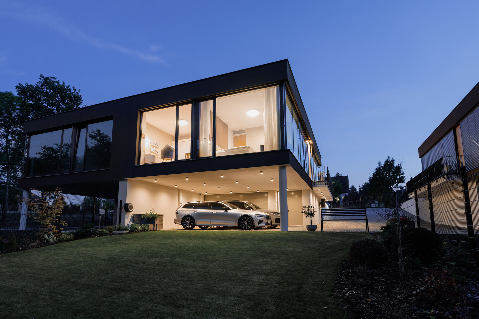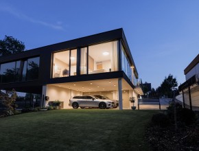Ve spodní části domu se nachází prostorná dvojgaráž s podlahovým vytápěním a dostatek úložného prostoru, další dvě parkovací stání jsou před garáží. Zahrada je vybavena automatickým zavlažovacím systémem a nabízí nerušený výhled do zeleně.