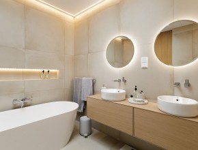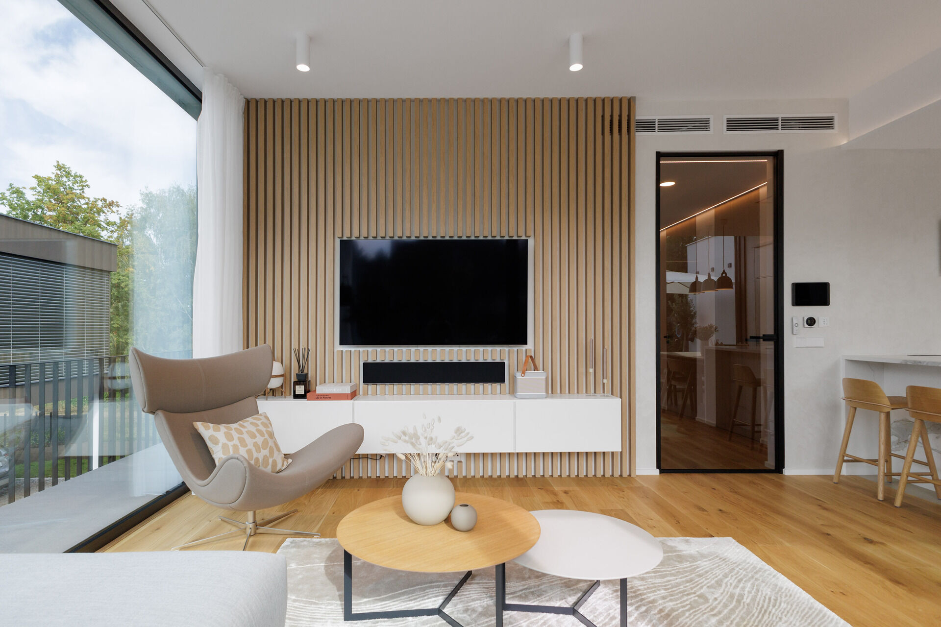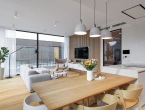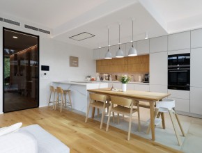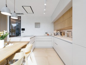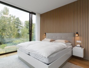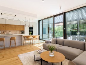 Dům disponuje vstupní halou, třemi ložnicemi a vzdušným obývacím pokojem s kuchyňskou linkou značky Schüller vybavenou spotřebiči Siemens a přímým vstupem na terasu. K dispozici jsou dvě koupelny kompletně vybavené sanitární technikou a nábytkem Laufen (vana i sprchový kout) a praktická technická místnost.