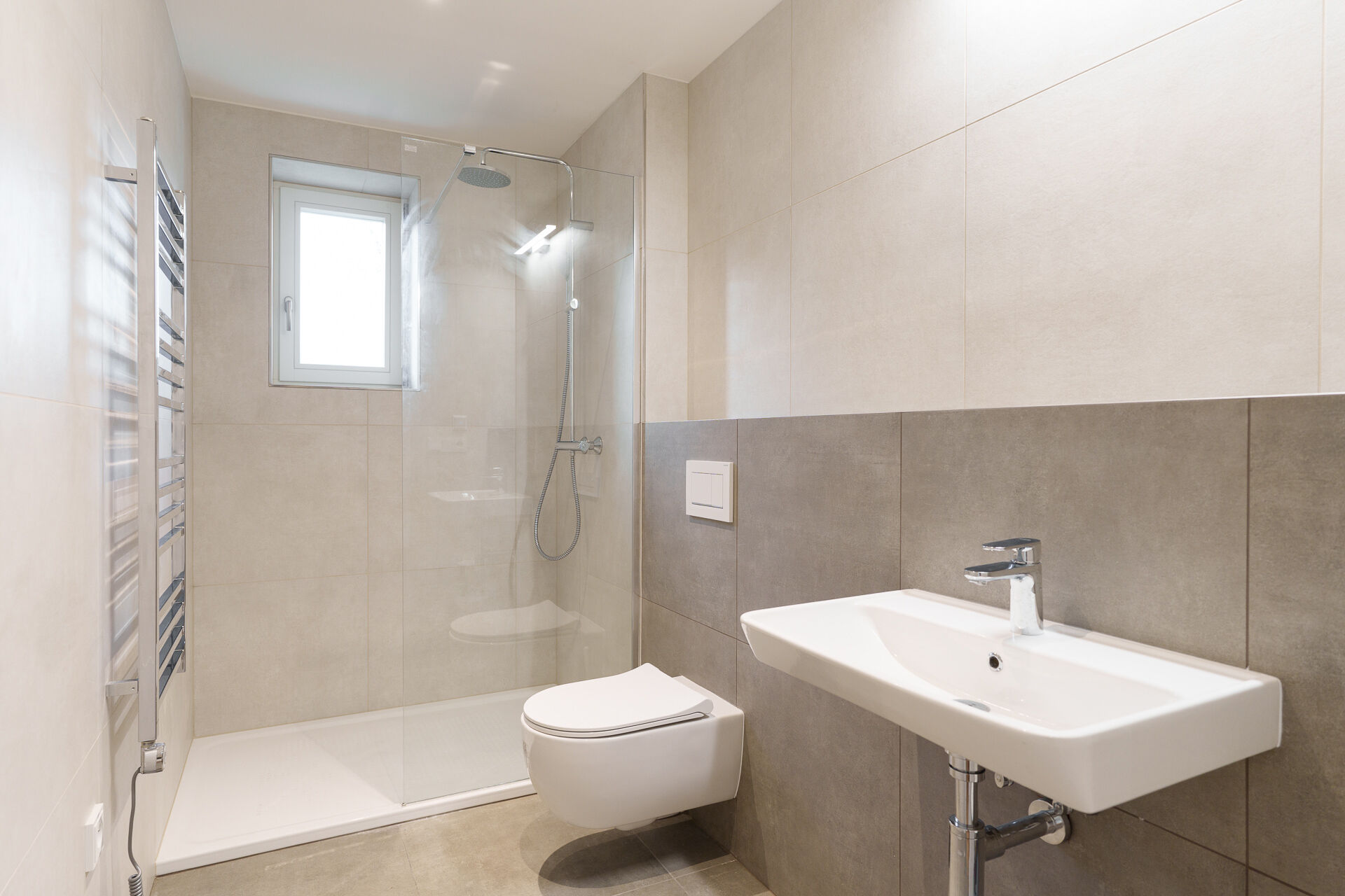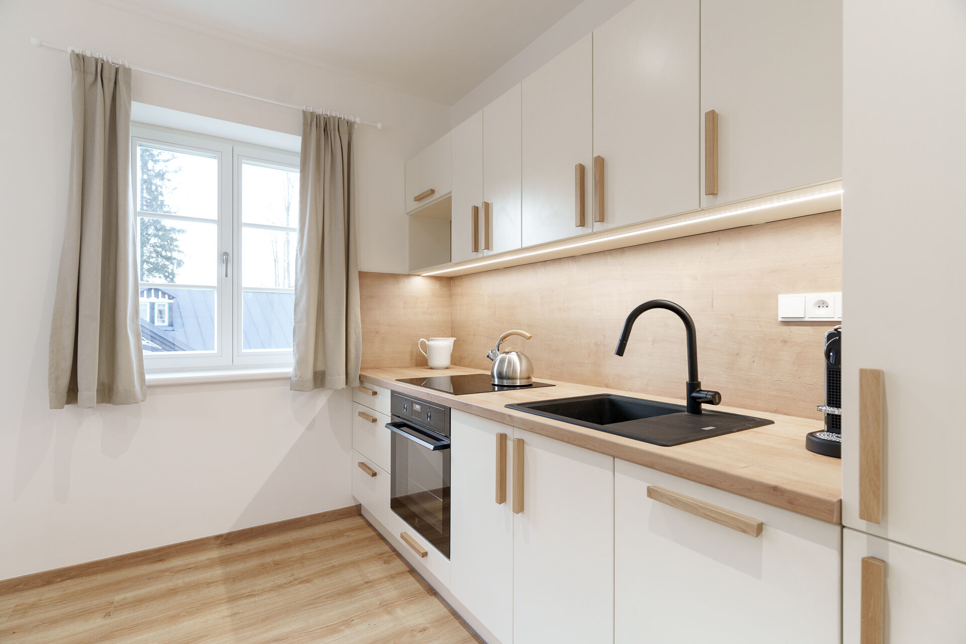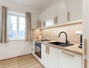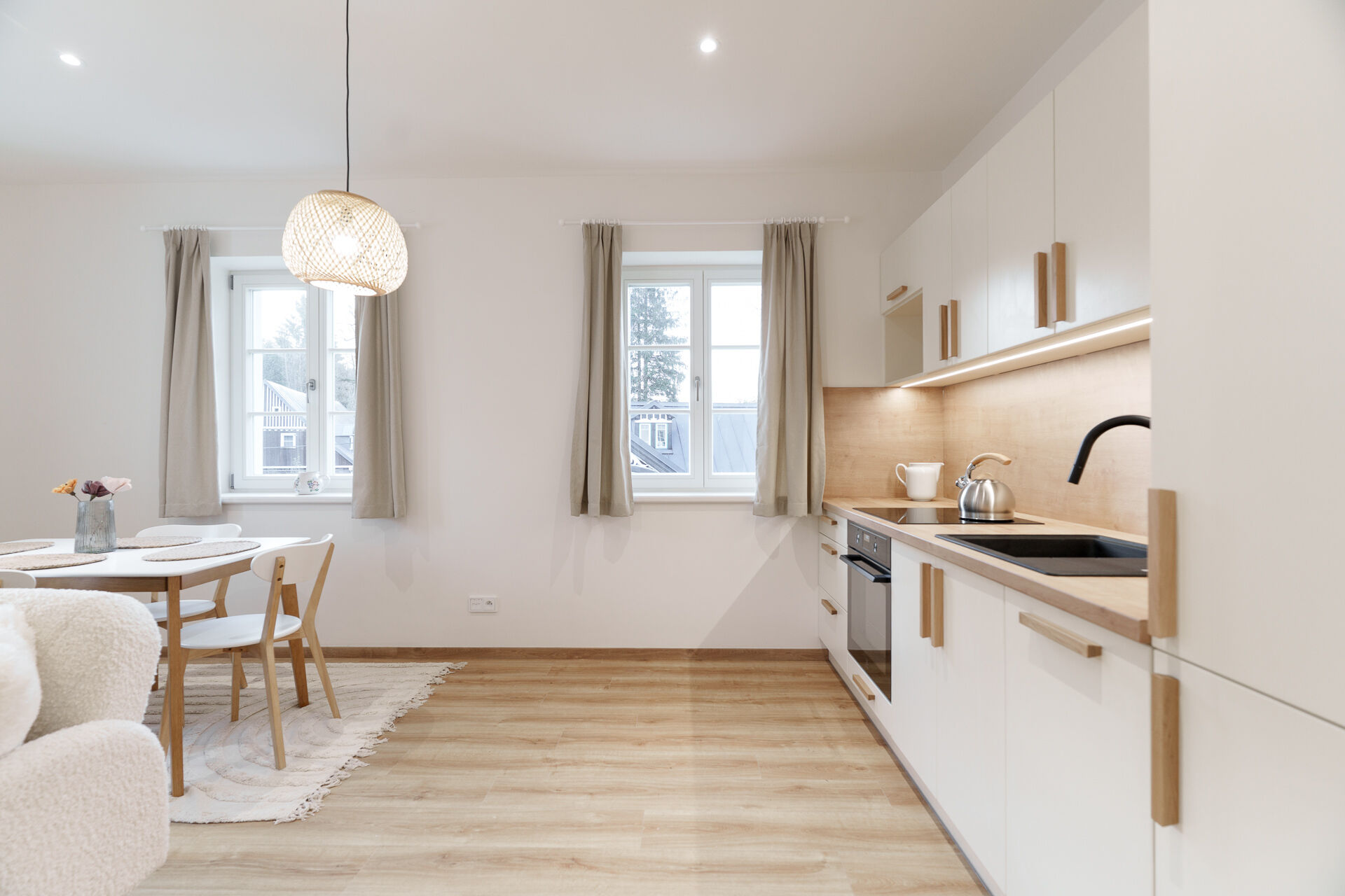 Interiér působí vzdušně a nabízí příjemné rozložení místností. Součástí standardu je moderní kuchyňská linka vybavená troubou, varnou deskou, myčkou nádobí a mikrovlnnou troubou. Koupelna je osazena sanitou značek Hansgrohe, SAT a Kaldewei, podlahy tvoří vinyl v dekoru dubu a komfort zajišťuje elektrické podlahové vytápění s možností chytré regulace.