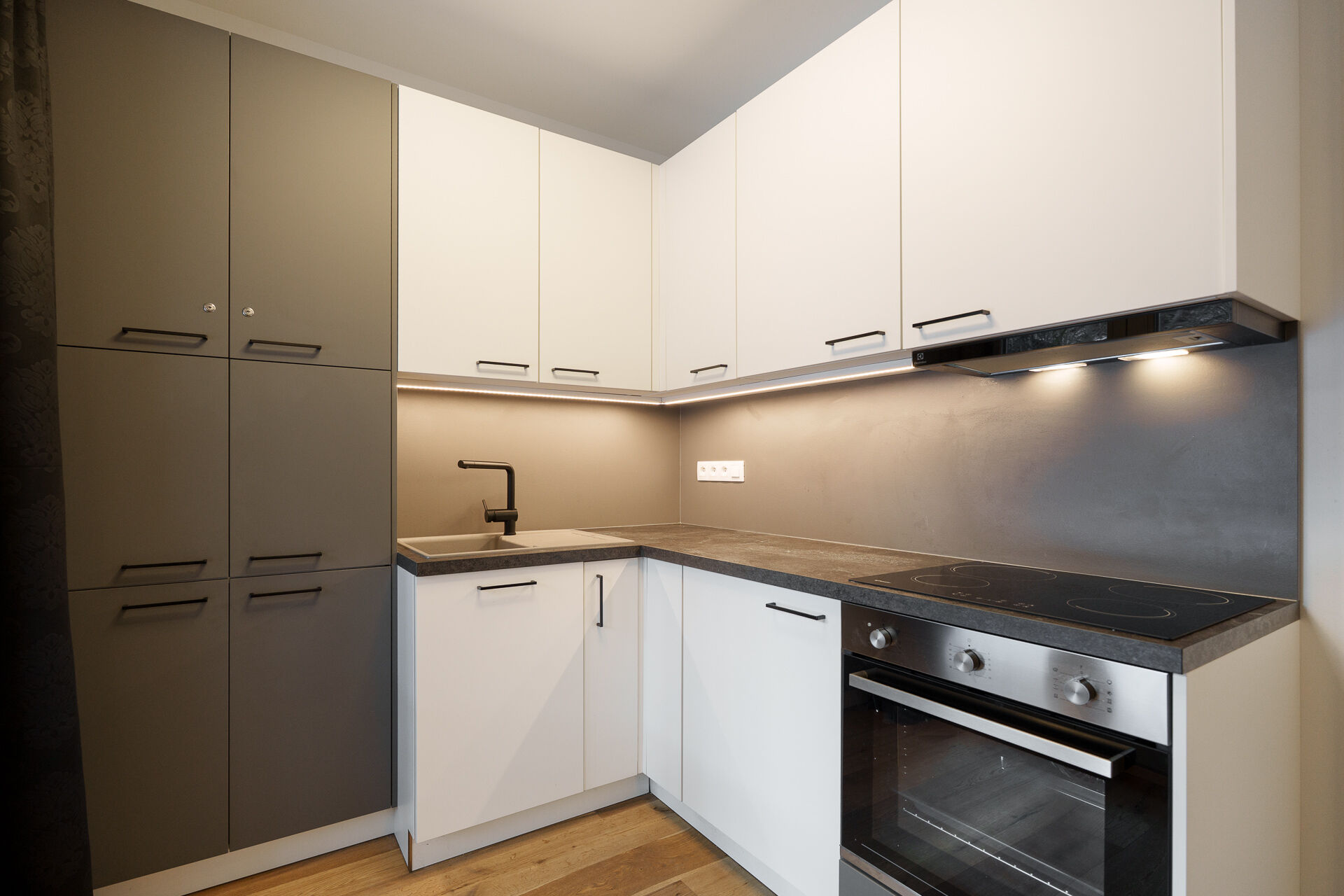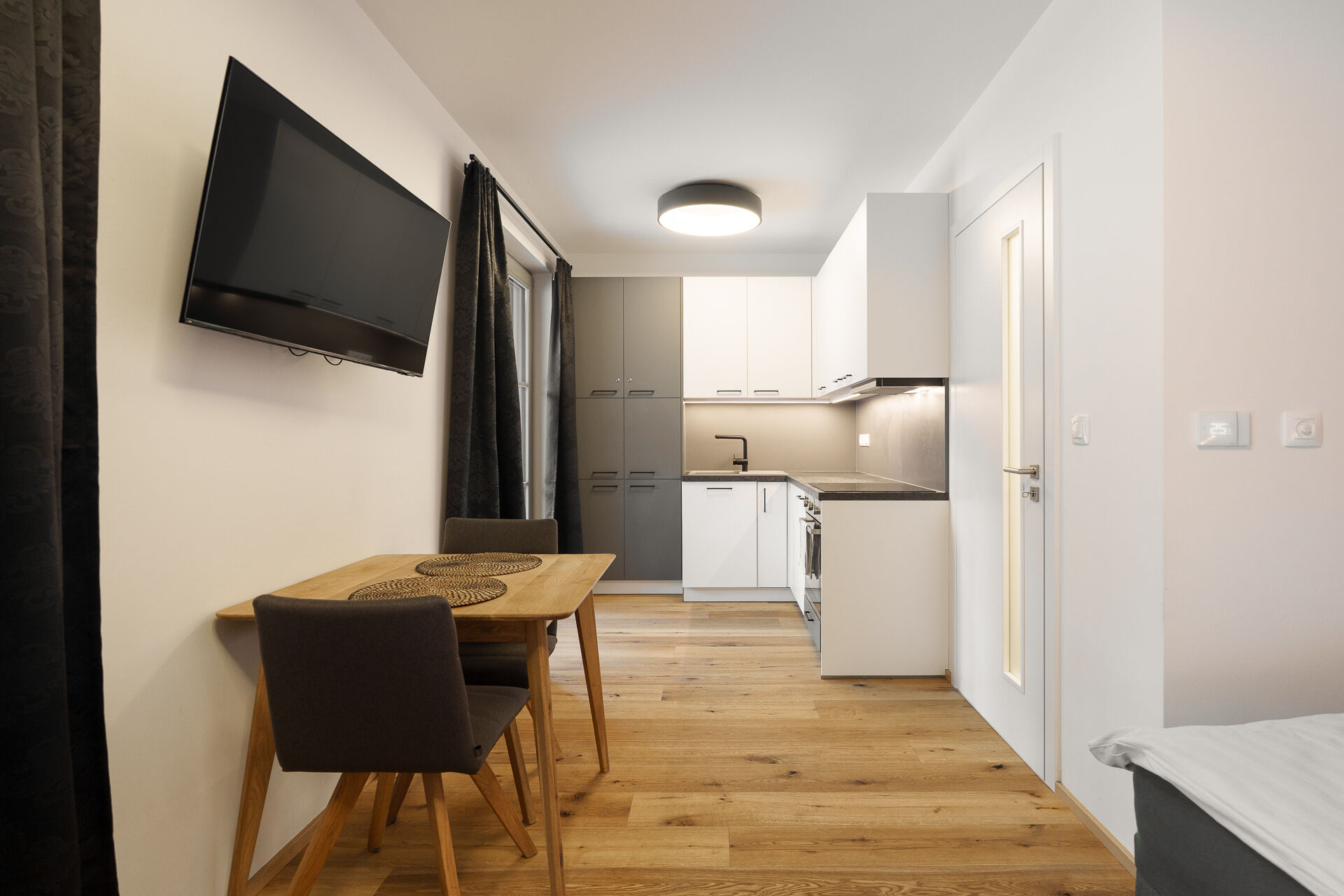 Obytný prostor je vybaven dřevěnou podlahou, která dodává interiéru příjemnou horskou atmosféru. Součástí je kuchyňská linka s vestavnou troubou, varnou deskou a lednicí, která poskytuje vše potřebné pro pohodlné užívání i krátkodobé pobyty. Koupelna je řešena v moderním stylu a nabízí sprchový kout a toaletu.